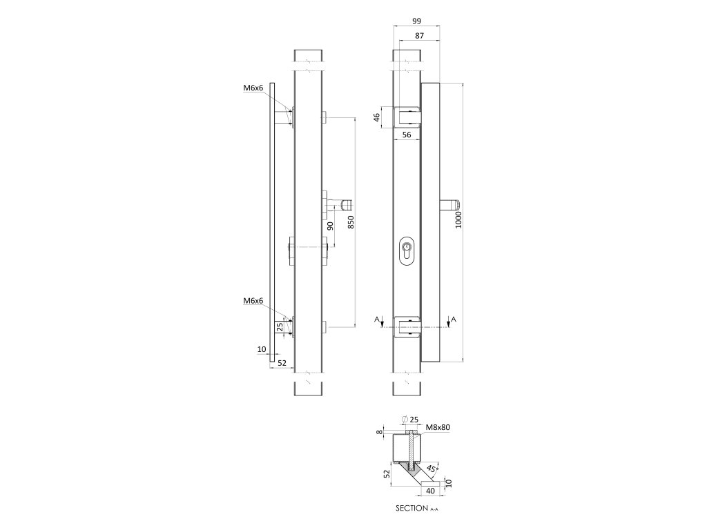 Madlo 45° a kľučka ľavá, L = 1000 mm, AISI 304