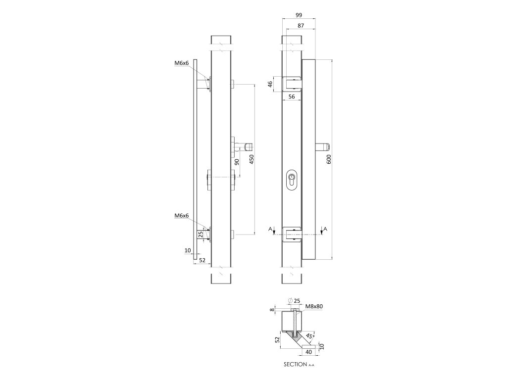 Madlo 45° a kľučka ľavá, L = 600 mm, AISI 304