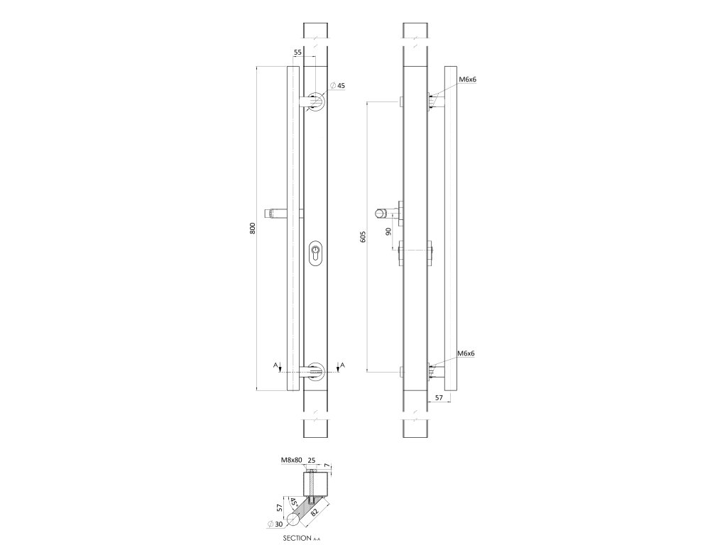 Madlo 45° a kľučka ľavá, L = 800 mm, AISI 304