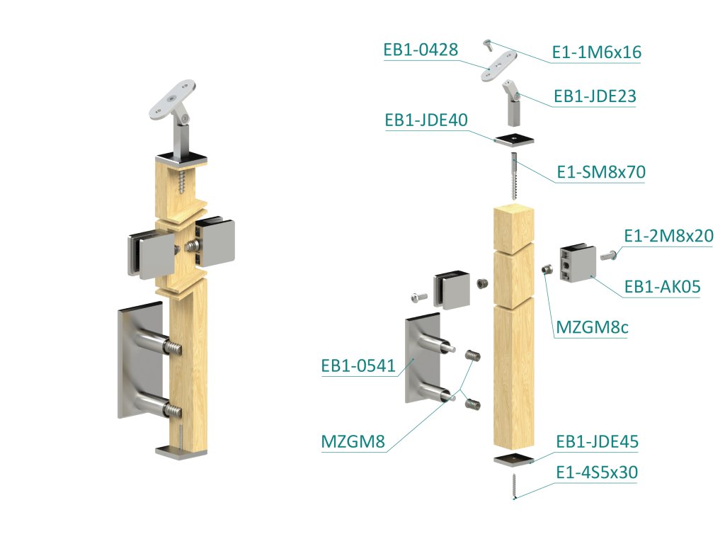 Drevený stĺp, bočné kotvenie, výplň: sklo, priechodný