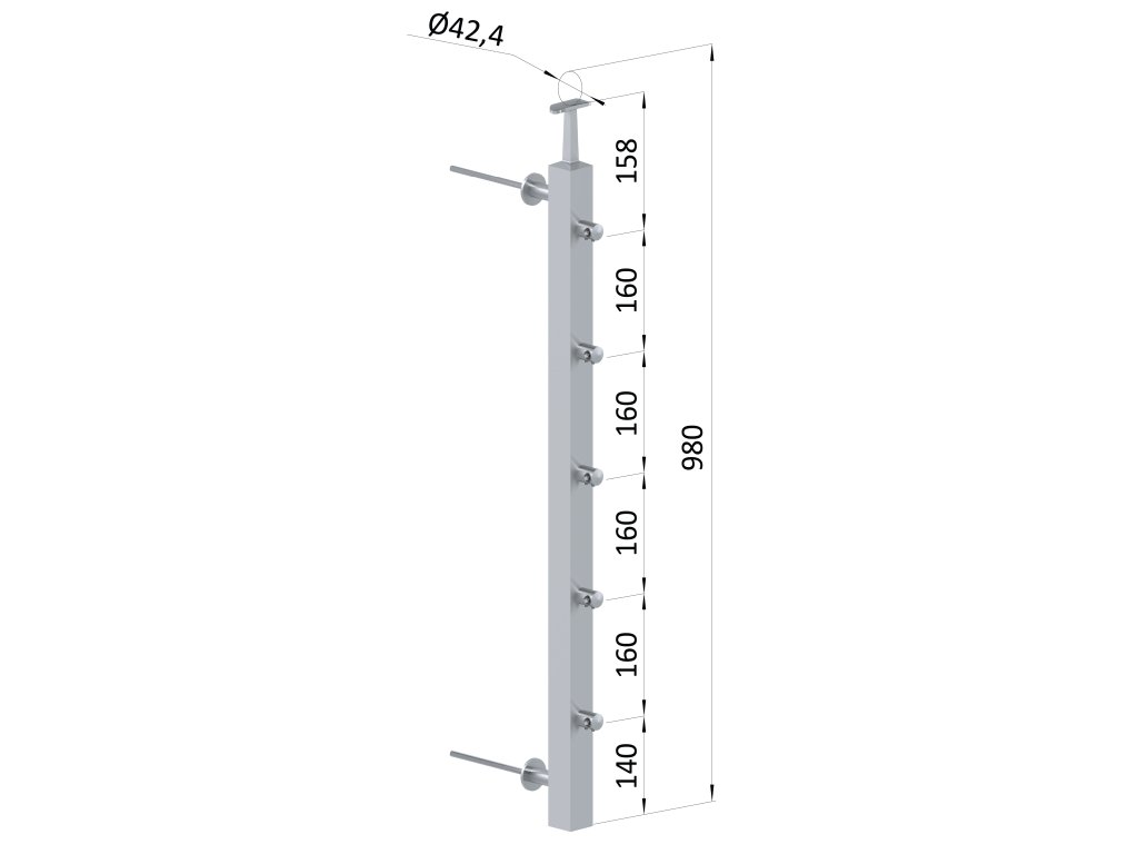 nerezový stĺp na francúzsky balkón, bočné kotvenie, 5 radový priechodný, vrch pevný, (40x40x2.0mm), brúsená nerez K320 /AISI304
