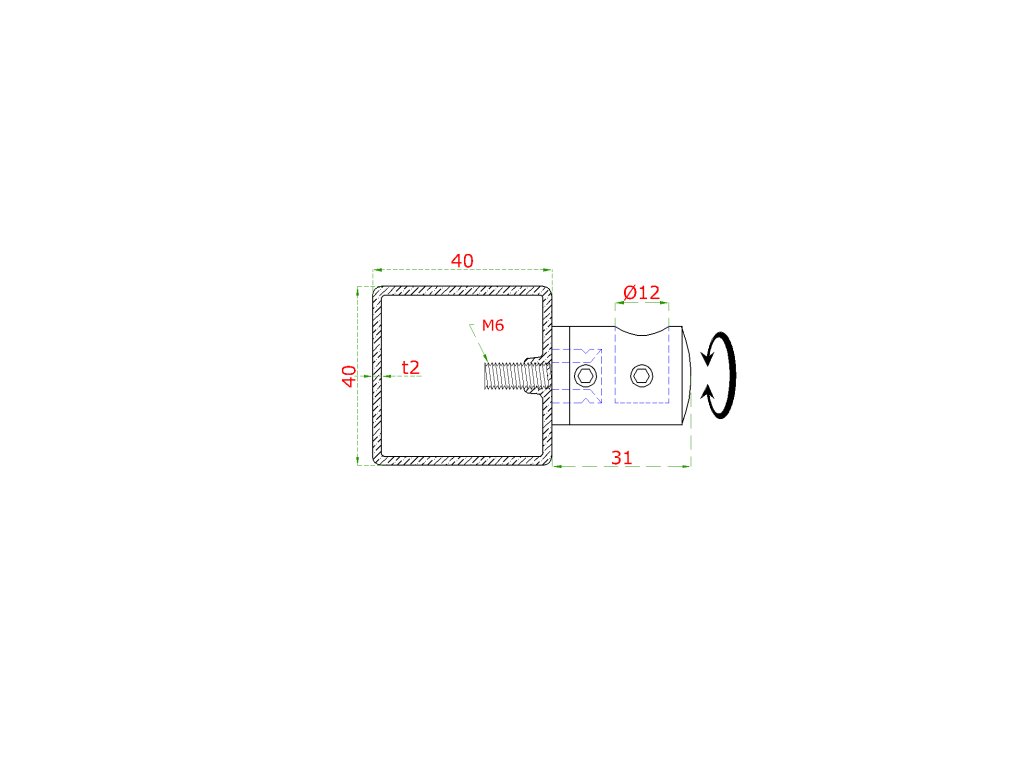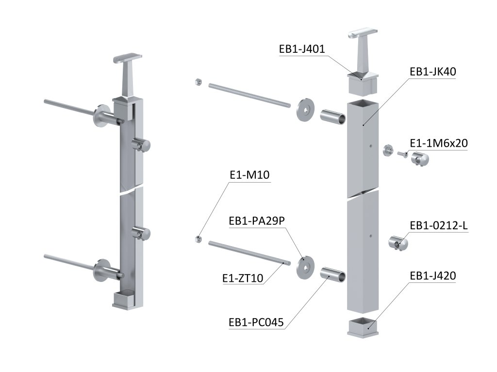 nerezový stĺp na francúzsky balkón, bočné kotvenie, 5 radový ľavý, vrch pevný, (40x40x2.0mm), brúsená nerez K320 /AISI304