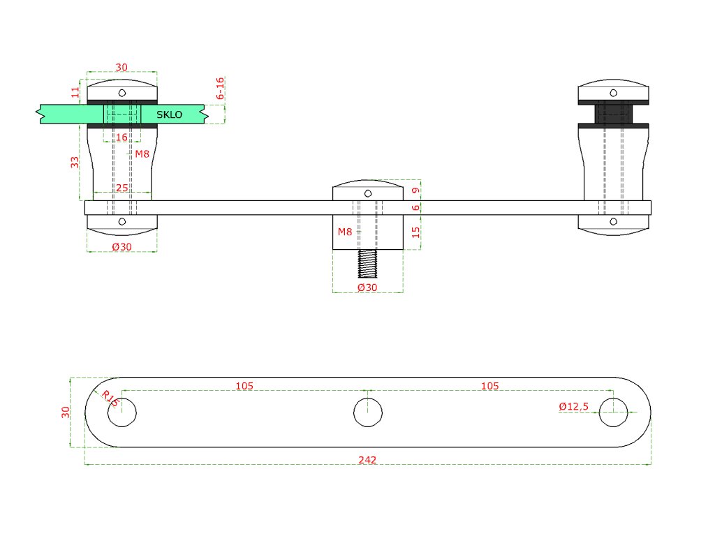 bočné kotvenie na sklo 6-16mm (ploché), dve bodové svorky skla ø 30mm, brúsená nerez K320 /AISI304/, balenie obsahuje gumičky na sklo