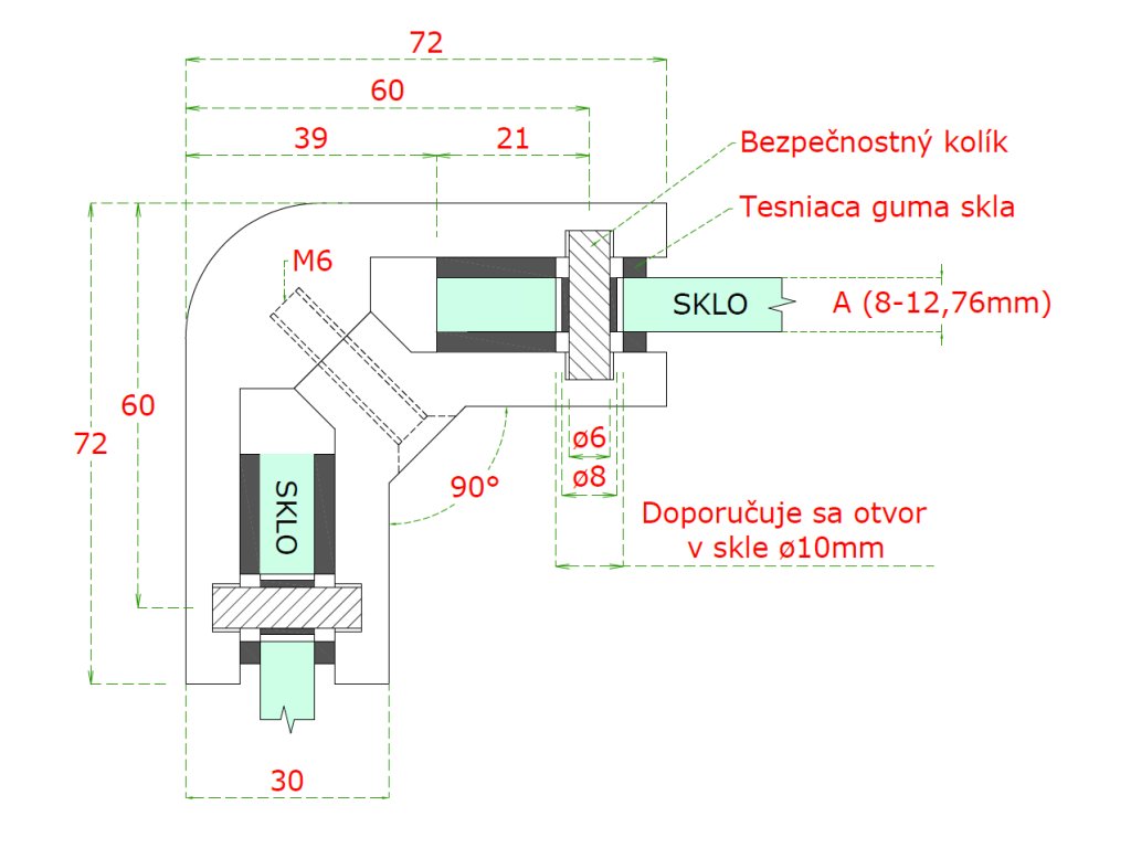 svorka skla rohová 90˚ (72x45x30mm), na sklo 8-12.76mm, brúsená nerez K320 /AISI304, balenie neobsahuje gumičky na sklo