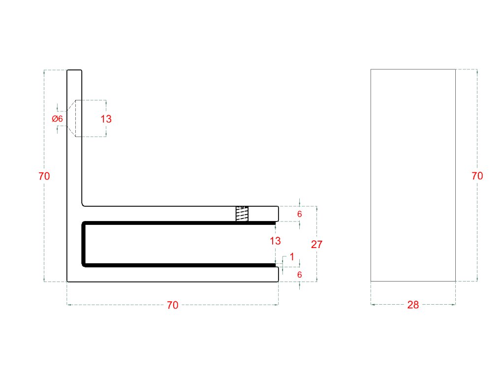 úchyt skla na stenu (70x70x28mm), pre sklo 12mm, brúsená nerez K320 /AISI316