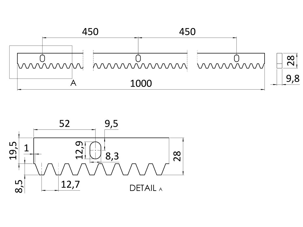 hrebeň INOX 30x10mm, L-1000mm, M4, max. do 1900kg, 3x úchyt+skrutky, nerezový