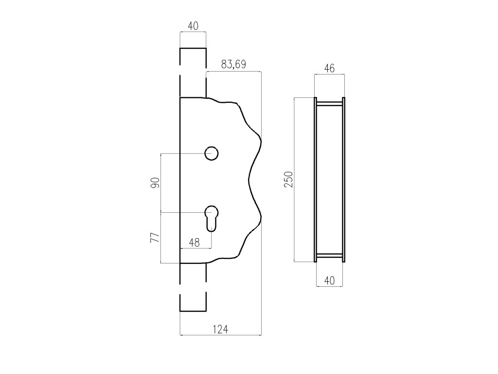 Kazetová zostava pre bránku 250x95x40mm, otvor pre kľučku ø 20mm, na profil 40x40mm, hladká, pre zámok ZM90/80