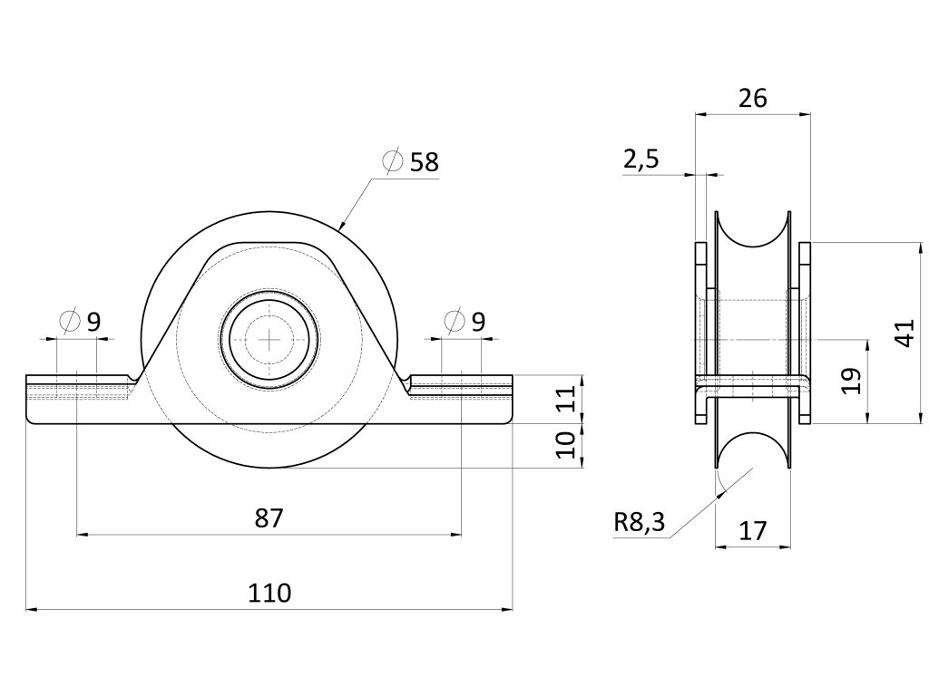 Vodiaca kladka ø 58 mm s nylonovým kolieskom, AISI 304