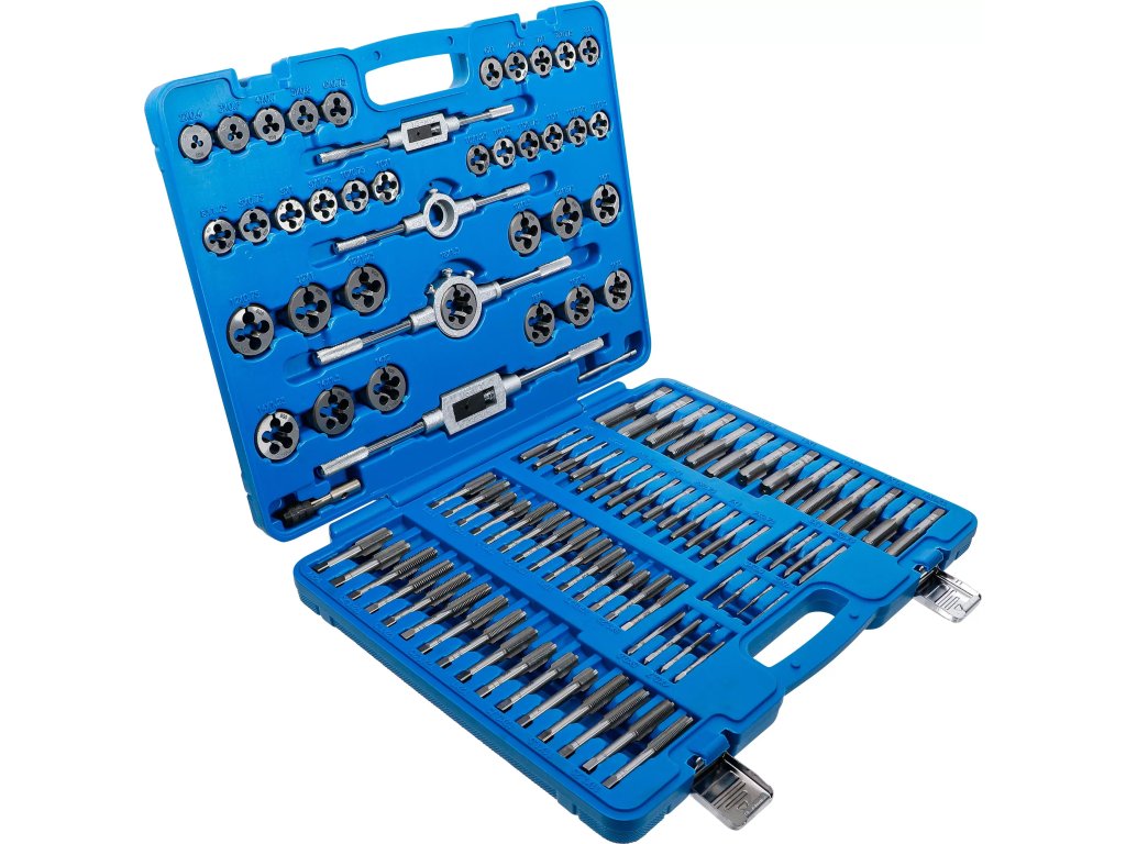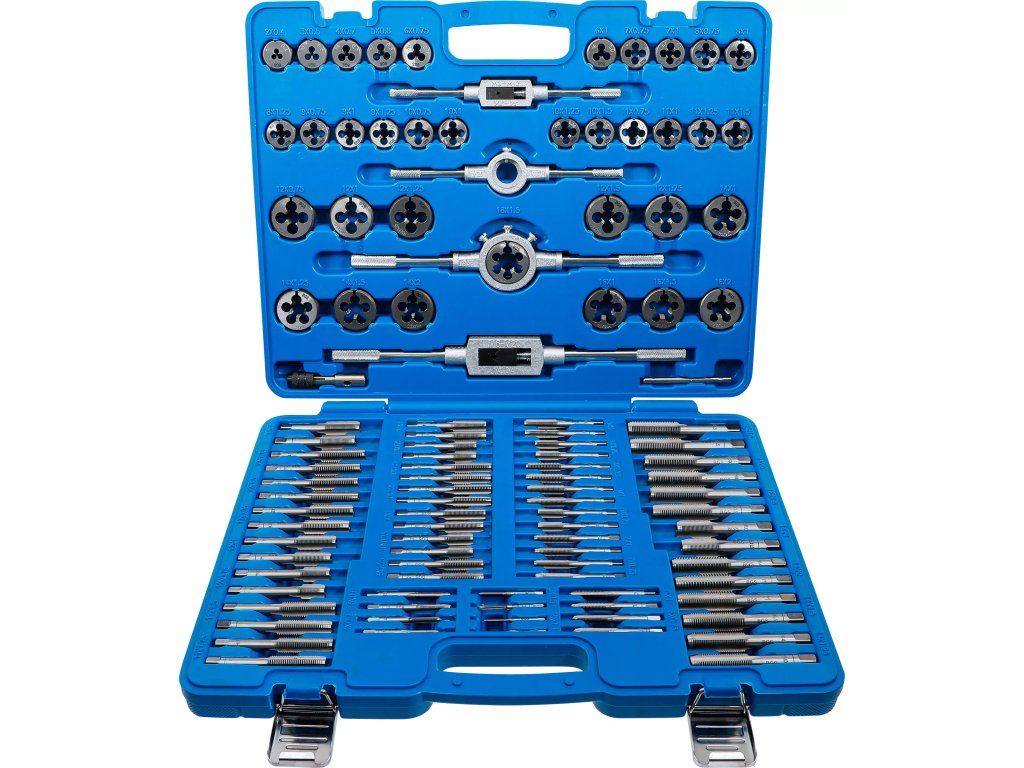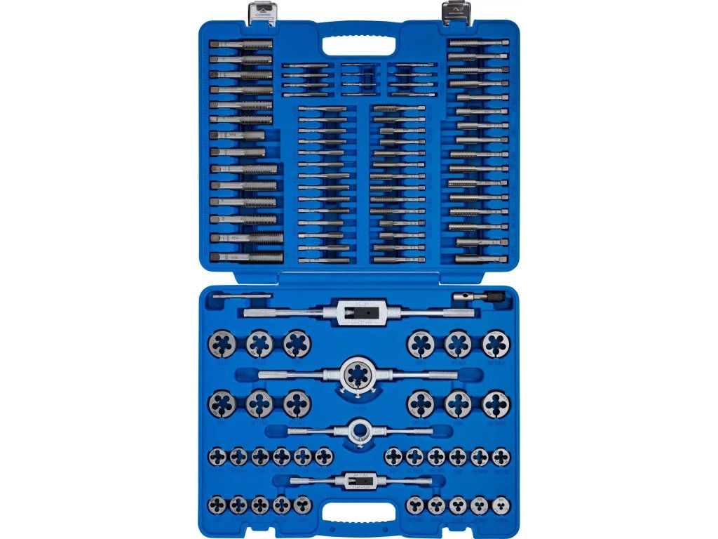 Profesionálna súprava na rezanie vnútorných aj vonkajších metrických závitov. Obsahuje široký rozsah veľkostí od M2 po M18 vrátane viacerých stúpaní. Je vhodná pre dielenské použitie, servisné pracoviská aj domácich používateľov, ktorí potrebujú presne vytvárať závity.