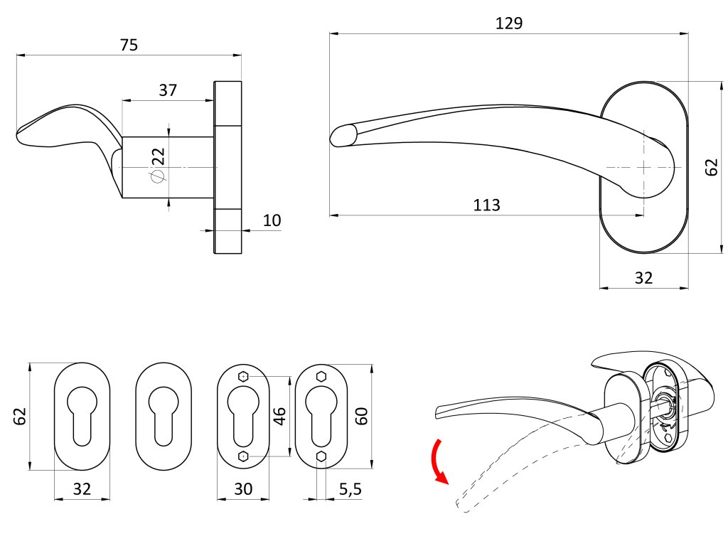 Kľučka vrátane dolnej rozety, brúsená nerez AISI 304