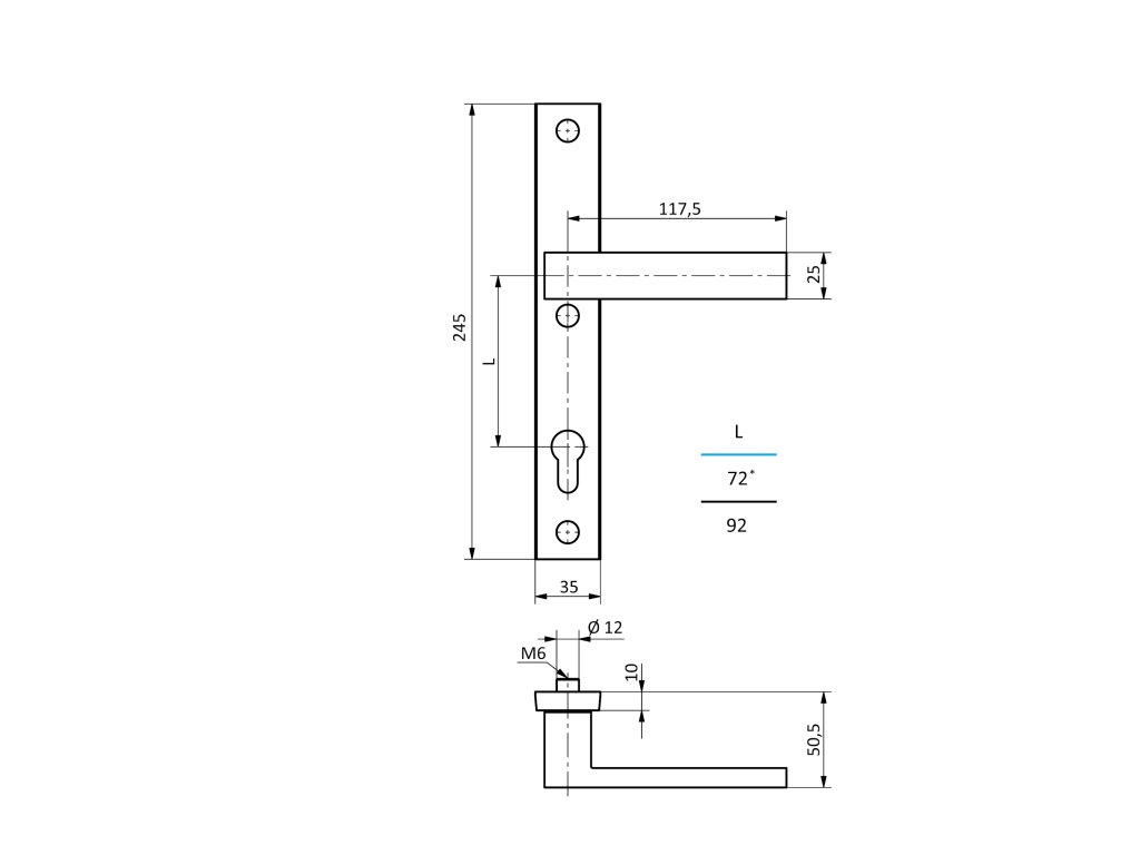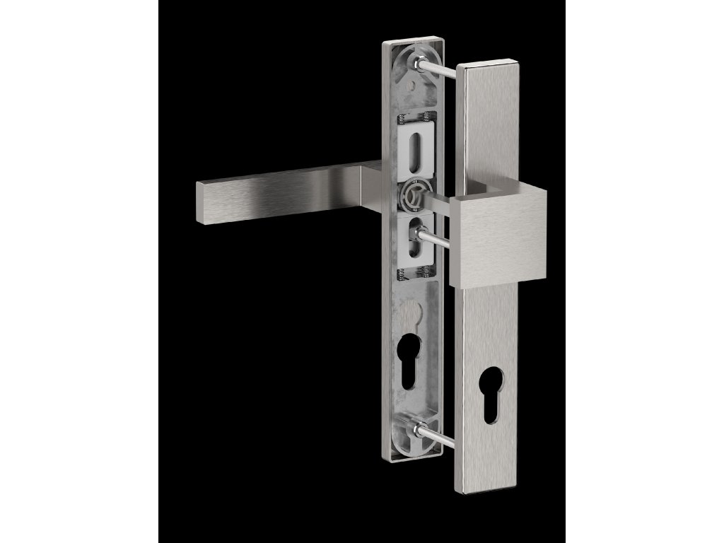 Kompletná sada hliníkového kovania v štítovom prevedení, určená pre vstupné dvere, brány a bránky. Sada kombinuje pohyblivú kľučku na vnútornej strane a pevnú guľu na vonkajšej strane. Toto riešenie zvyšuje bezpečnosť, pretože z vonkajšej strany je na otvorenie dverí vždy nutné použiť kľúč. Štítové prevedenie elegantne zakrýva zadlabávací zámok a montážne otvory, čím vytvára čistý a ucelený vzhľad.