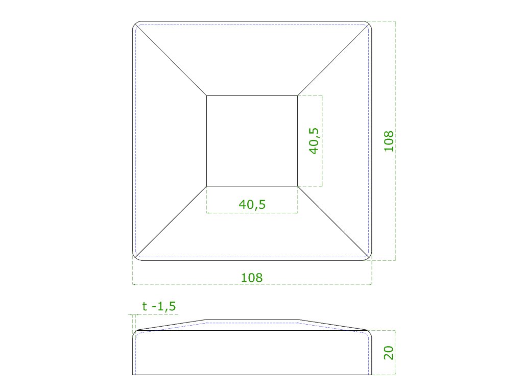 kryt spodnej príruby (108 x 108/25 x 1,5 mm), otvor: 40,5 x 40,5 mm, na profil 40 x 40 mm, brúsená nerez K320 /AISI 304