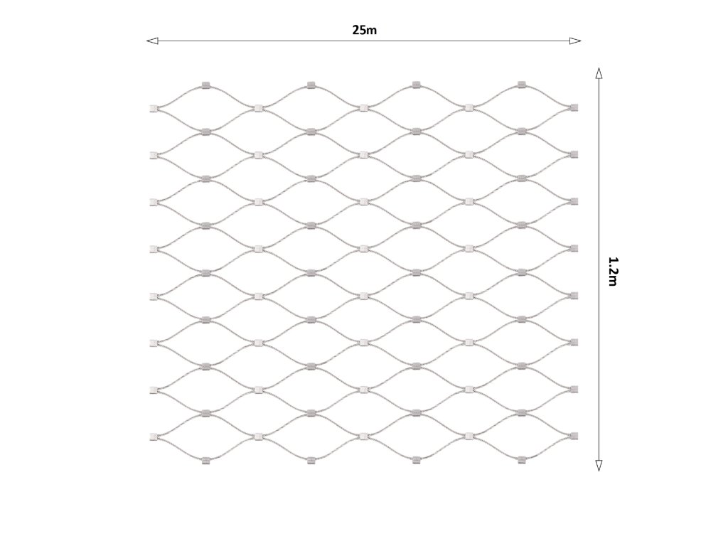 Nerezová lanková sieť, 1.2mx25m (šxd), oko 60x104mm, hrúbka lanka 2mm, AISI316 (V nerozloženom stave má sieť 29.8m)