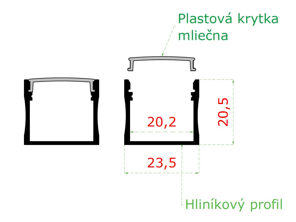 Balenie obsahuje hliníkový profil 1250mm, plastovú krytku a 2x ukončenie