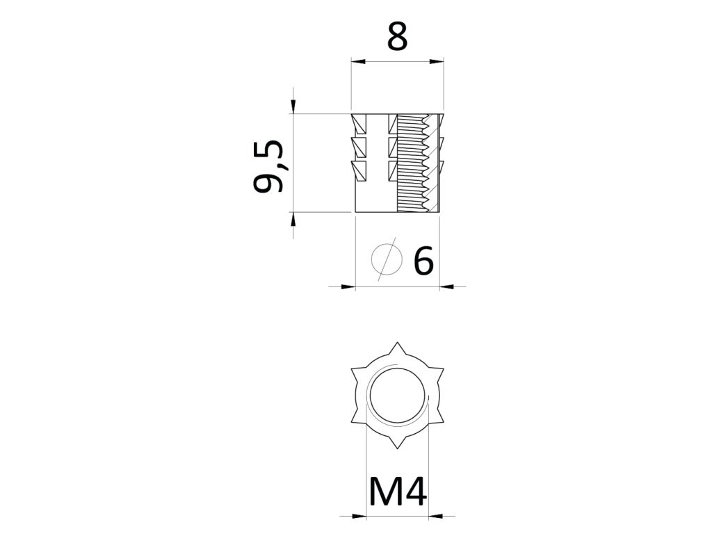 Narážacia matica do dreva M4 x 9,5 mm, zinková zliatina
