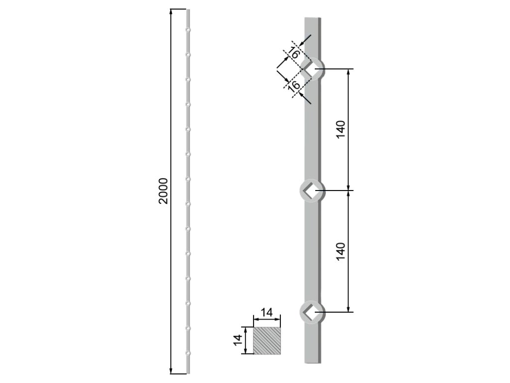 Prebíjaná tyč H 2000mm opieskovaná, profil 14 x 14 mm, rozteč dier 140 mm, oko 16 x 16 mm - 14 ks