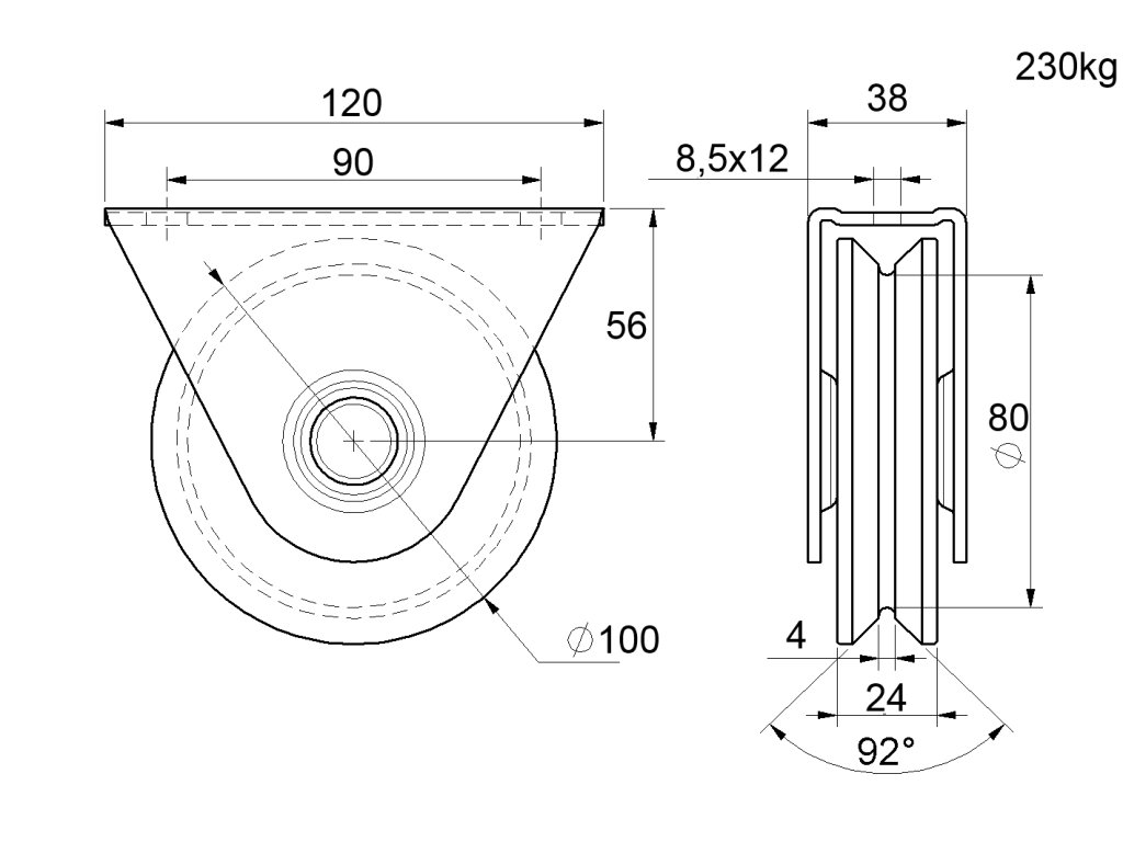 Vodiace koliesko ø 100 mm, V profil, nosnosť 230 kg