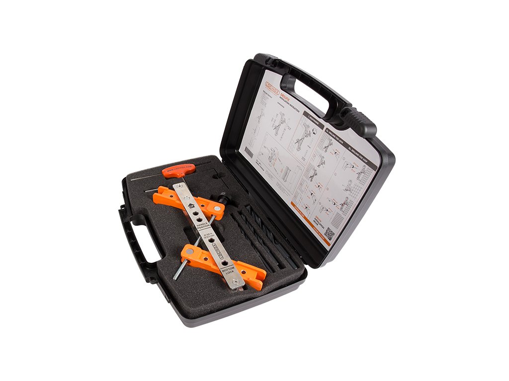 Sada náradia pre rýchlu a presnú montáž zámkov a dorazových líšt LOCINOX®. Pomocou prípravku DRILL-FIX ľahko vystredíte a vyvŕtate otvory na okrúhly, štvorcový alebo obdĺžnikový profil. DRILL-FIX sa dodáva v praktickom a pevnom kufríku, ktorý obsahuje potrebné náradie a prípravky na inštaláciu zámkov a dorazových líšt Locinox.