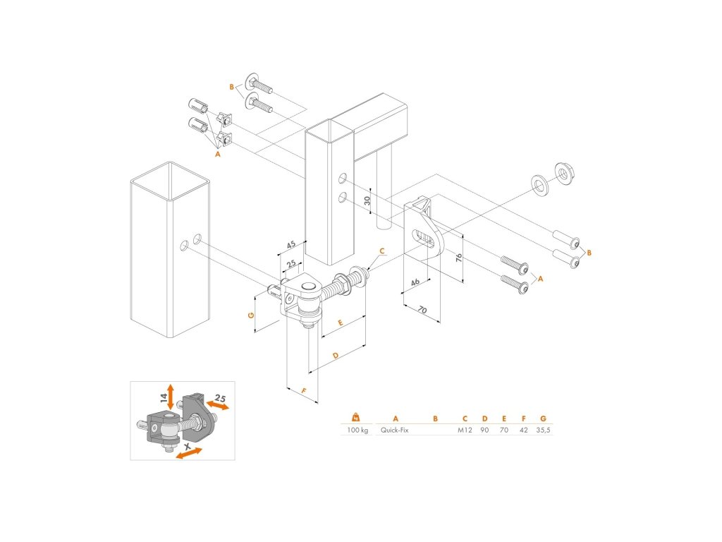 - Nastaviteľný: na šírku 51 mm (X), na výšku 14 mm (Y), na hĺbku 25 mm (Z)