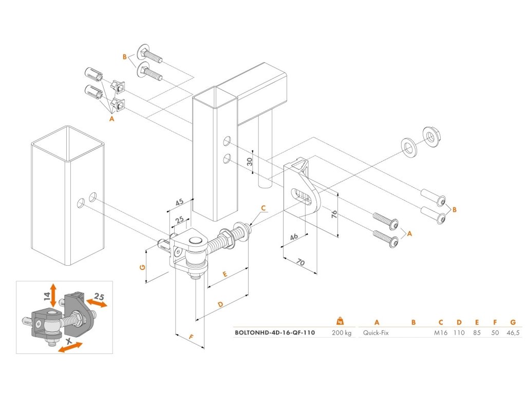 - Nastaviteľný: na šírku 51 mm (X), na výšku 14 mm (Y), na hĺbku 25 mm (Z)