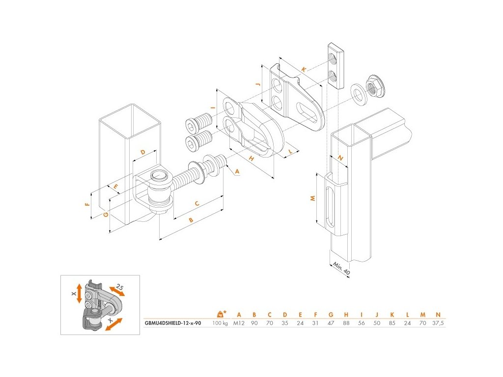 Po inštalácii je nastaviteľný v troch-smeroch. Nastavením závesu docielite súbežnosť vyosených krídiel (napríklad vyosenie stĺpika vplyvom mrazu). Záves umožňuje reguláciu 25 mm na šírku (X),.19 mm na výšku (Y) a 41 mm na hĺbku (Z).