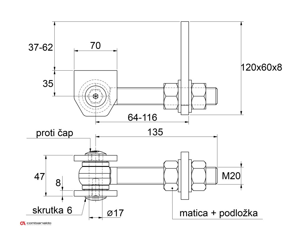 Regulovateľný, navárací bočný záves-pant, závit M20 od popredného talianského výrobcu Combi Arialdo. Povrchová úprava- pozink, 2x časť v tvare D /prizvára sa na krídlo brány/ a časť v tvare I /prizvára sa na stĺp/ - bez povrcovej úpravy. Použitie pre ľahké brány.