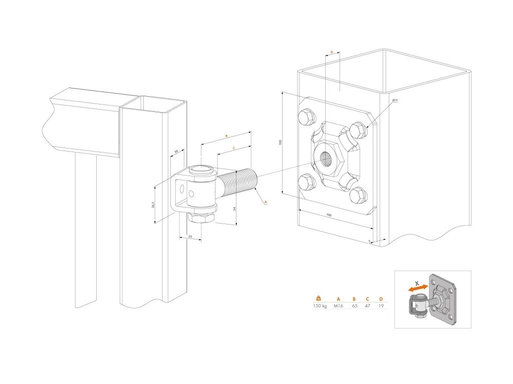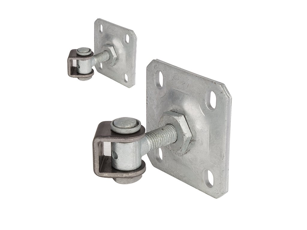 Záves otvárateľný 90° s montážnou platňou 100 x 100 mm. Zvýšená ochrana ANTIVANDAL prevedenie (pri zatvorenej bráne nie je možné manipulovať so závesnou skrutkou a s okom). Nastaviteľný 30mm na šírku (X).