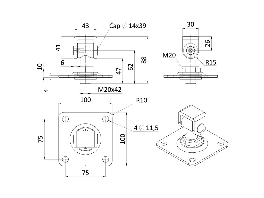 Záves M20 s platňou 100 x 100 mm, nastaviteľný 1D, pozink