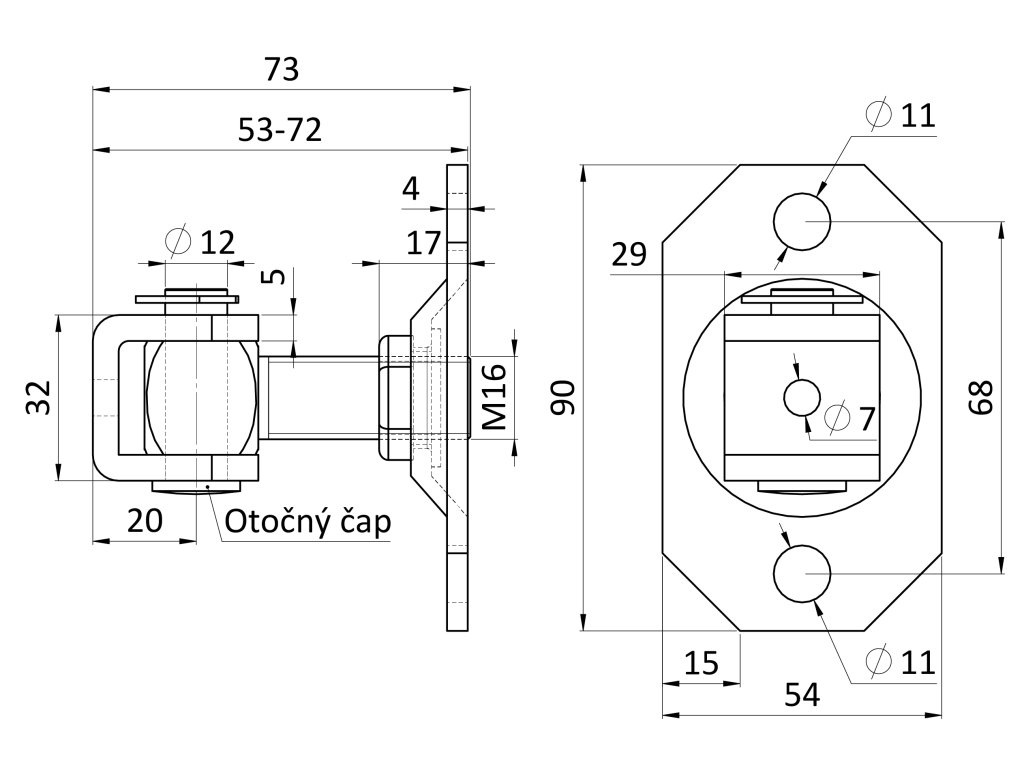 Záves nastaviteľný s platňou 54 x 90 mm, závit M16, pozink