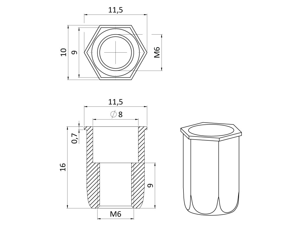 Nitovacia matica M6, mikro hlava, hex, L = 15,5 mm, nerez