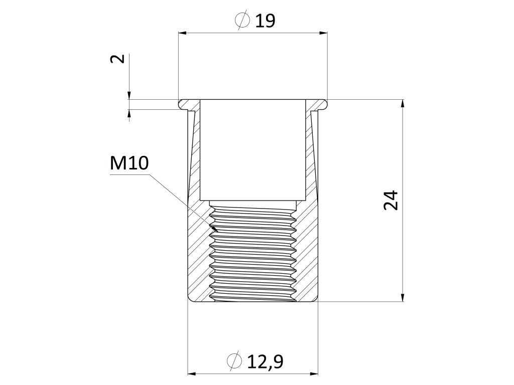 AISI 304 nitovacia matica M10, rýhovaný driek, L = 19 mm