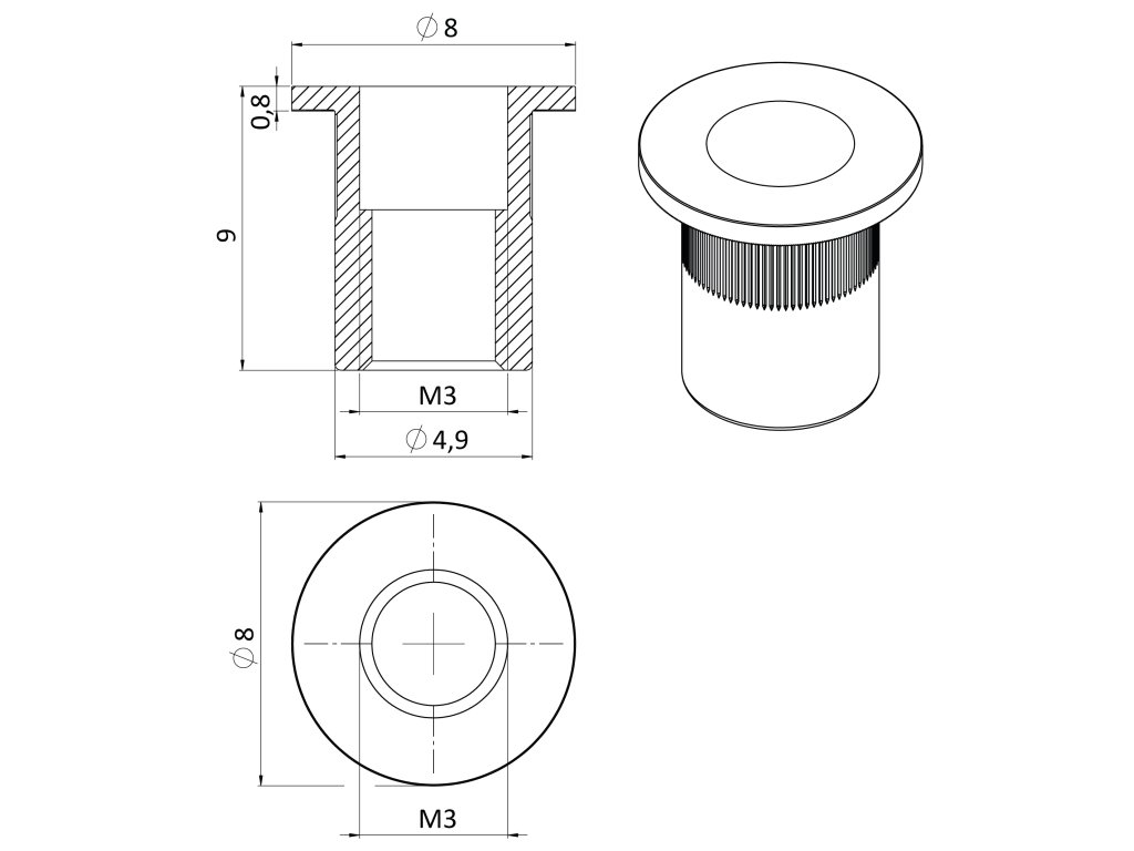 AISI 304 nitovacia matica M3, rýhovaný driek, L = 8 mm