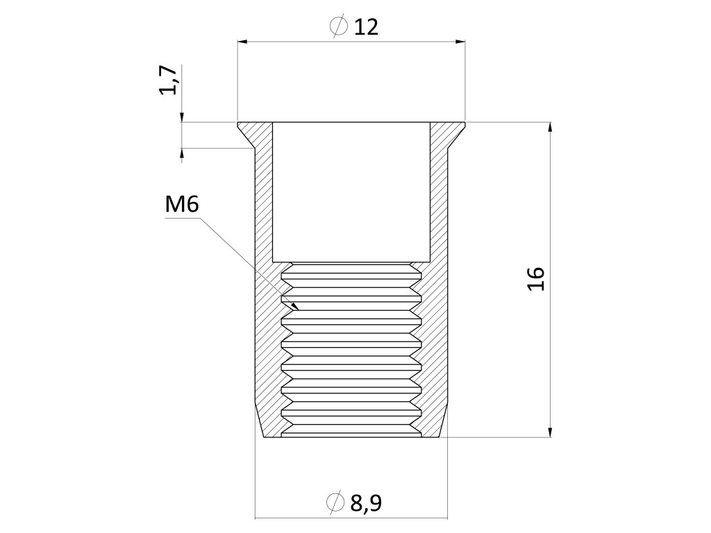 nerezová nitovacia matica M6, zapustená hlava, ryhovaný driek, AISI304