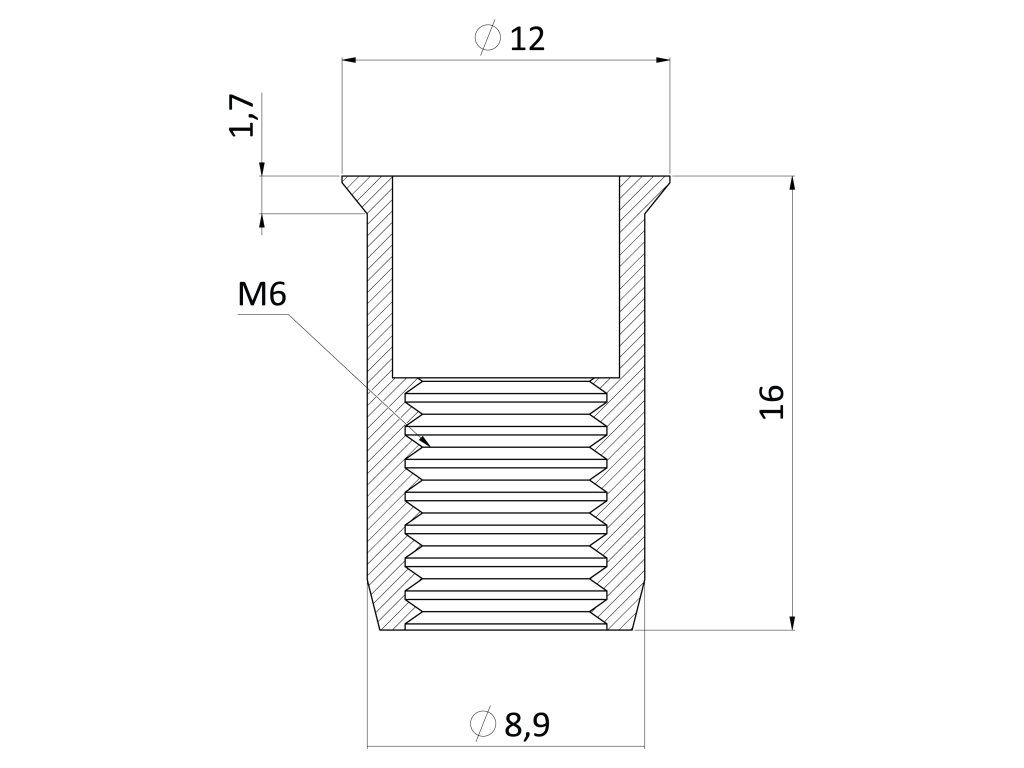nerezová nitovacia matica M6, zapustená hlava, ryhovaný driek, AISI304