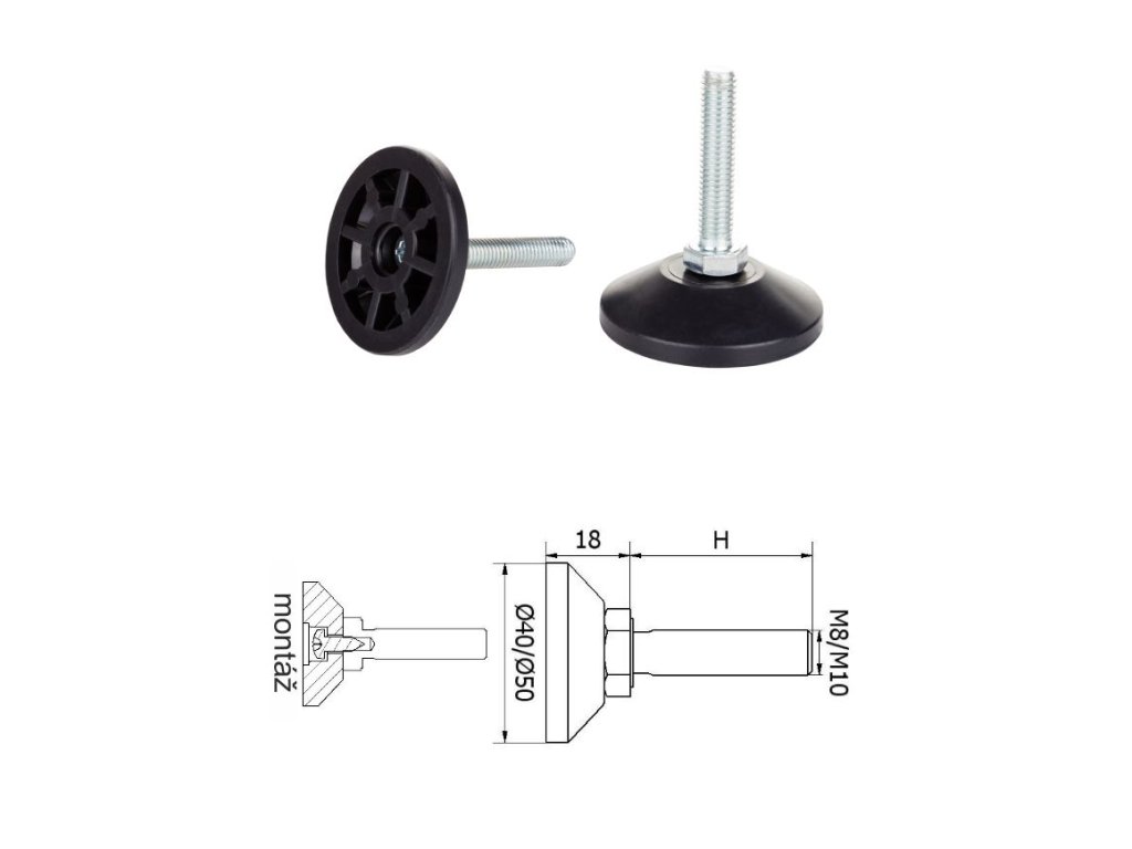 ø-50mm; M8x20mm; H-20mm, čierna,Bezkĺbová plastová nivelačná nožička; závitovo-nastavitelná.