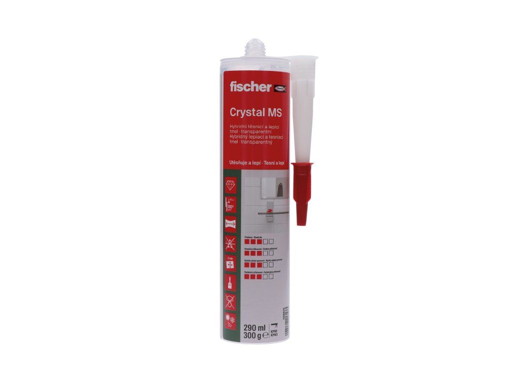 Transparentný fischer Crystal MS je dokonale vhodný na trvalé elastické tesnenie a lepenie na viditeľných miestach, najmä transparentných materiálov, ako je sklo. Izolačné materiály, lišty, panely a obklady možno bezpečne utesniť a zlepiť. Vďaka vysokej počiatočnej priľnavosti nie je vo väčšine prípadov potrebná predbežná fixácia. Vďaka vlastnostiam kompenzácie ťahu sa môže používať v exteriéri aj na prírodný kameň a vlhké podklady.