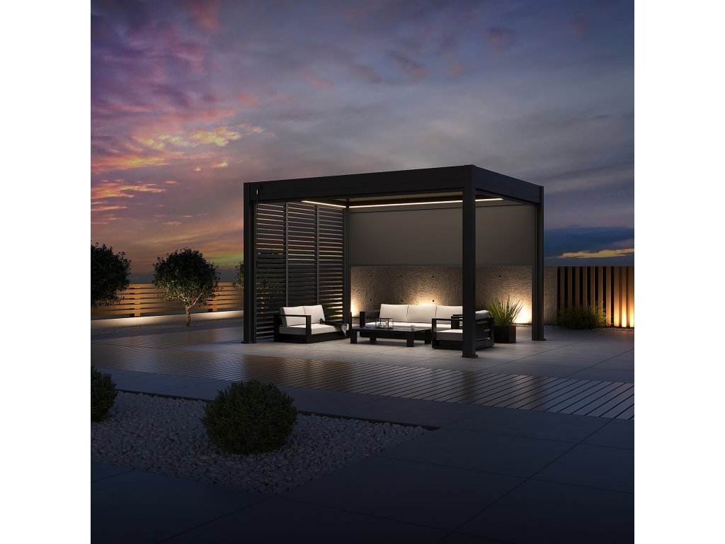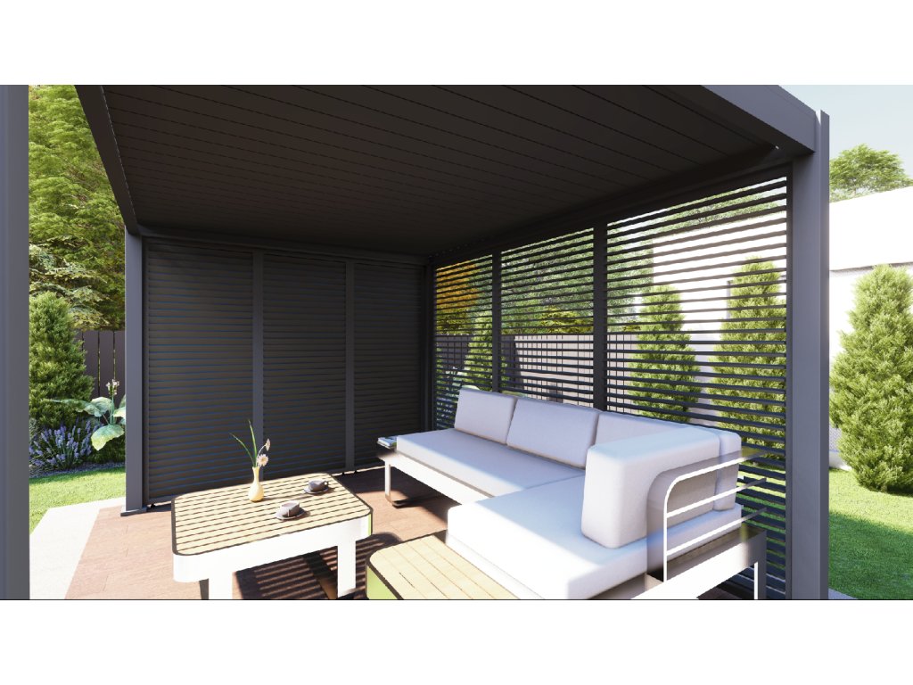 Pre maximálne využitie bioklimatickej pergoly ponúkame aj praktické príslušenstvo v podobe bočného panelu s horizontálnymi sklopnými lamelami, ktorý poskytuje dodatočné zatienenie a viac súkromia pri vonkajšom posedení.