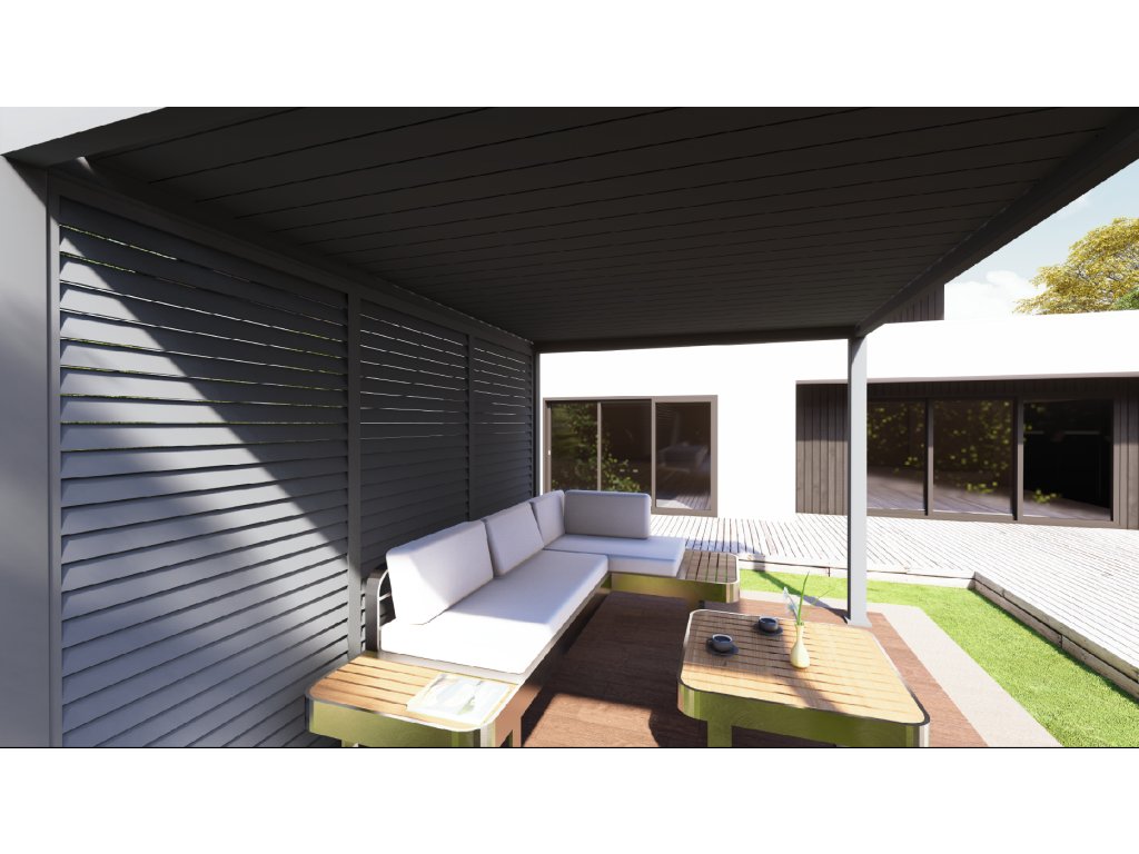 Pre zvýšenie komfortu a súkromia ponúkame doplnkový panel s horizontálnymi fixnými lamelami, určený na bočné alebo čelné zatienenie bioklimatických pergol. Tento panel zaisťuje nielen funkčnú ochranu pred slnkom či vetrom, ale zároveň dotvára moderný vzhľad celého exteriéru.