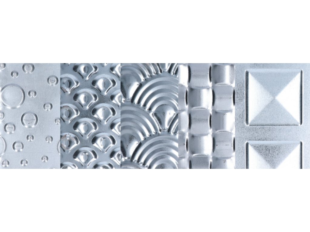 Vzorky dekoračných 3D plechov a tkaniny.