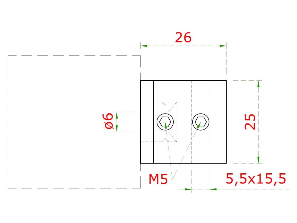 držiak plochej tyče 15/5mm, plochý, (26x25mm), brúsená nerez K320 /AISI304
