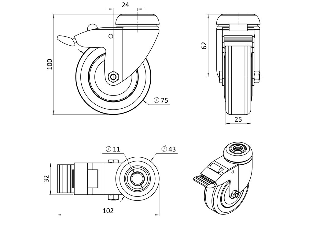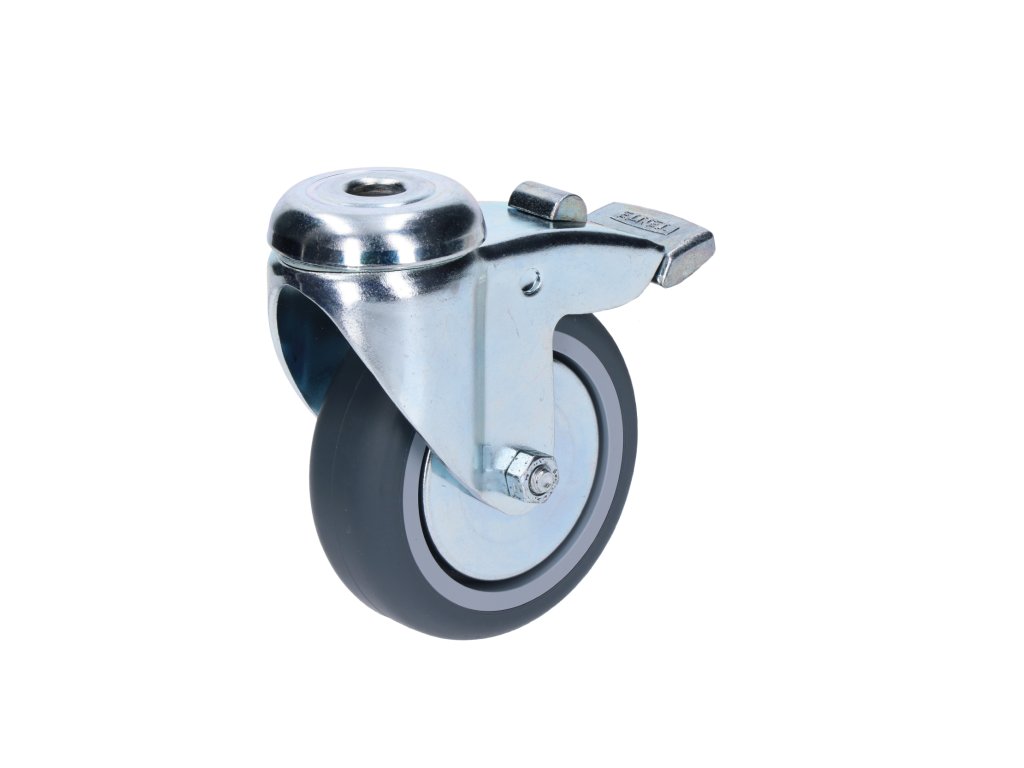 Otočné koliesko, vidlica vyrobená z oceľového výlisku - zinkovaná. Dvojitá guľôčková dráha v hlave otoče. Stredový otvor na čap priemeru 11mm. Stred kolieska vyrobený z polypropylénu, behúň kolieska z termoplatickej gumy - TENTEPRÉN. Klzné uloženie.