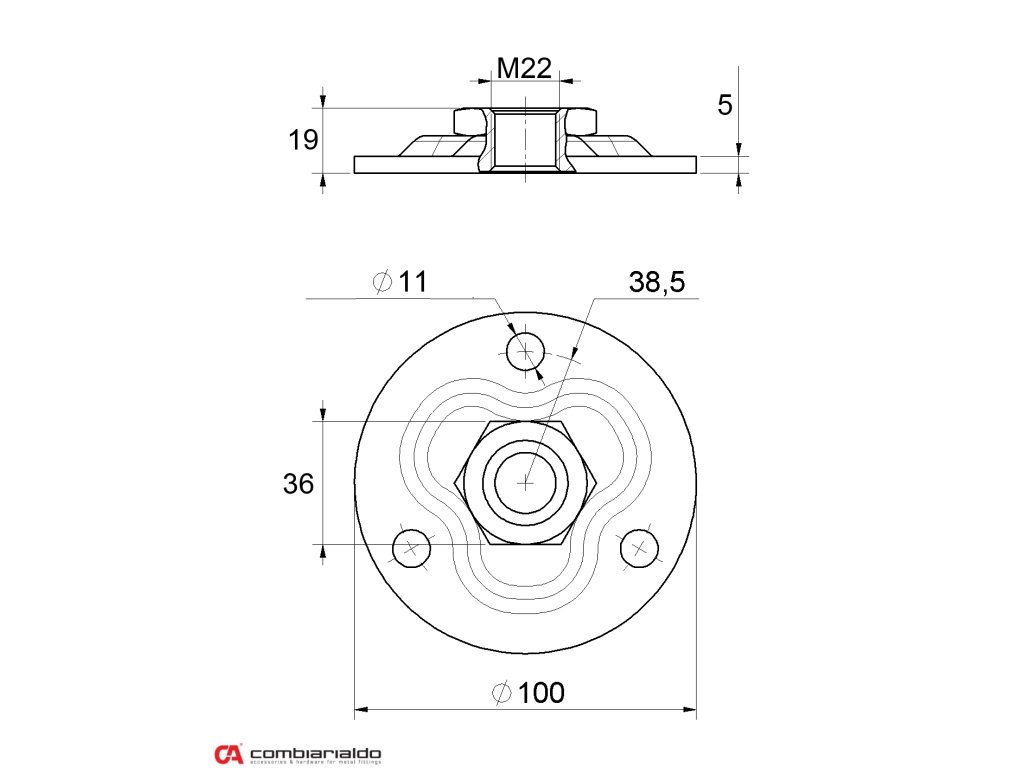 Kotviaca platňa v tvare kruhu 100x100 od popredného talianskeho výrobcu Combi Arialdo. Povrchová úprava- pozink, určená pre závitové úchyty M22 pre pevný úchyt do steny alebo na stĺp.