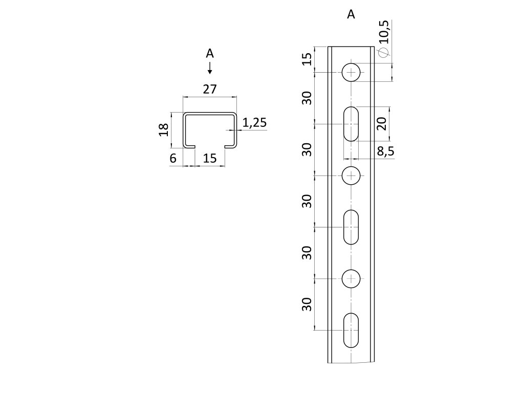 Dierovaný C profil, 27 x 18 x 1,25 x 3000 mm, pozinkovaný