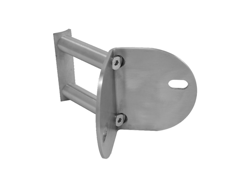 úchyt na vonkajšie rohové kotvenie stĺpu ø 42.4mm, (kotviaca platňa hrúbky 4mm, ø 100mm), brúsená nerez K320 /AISI304