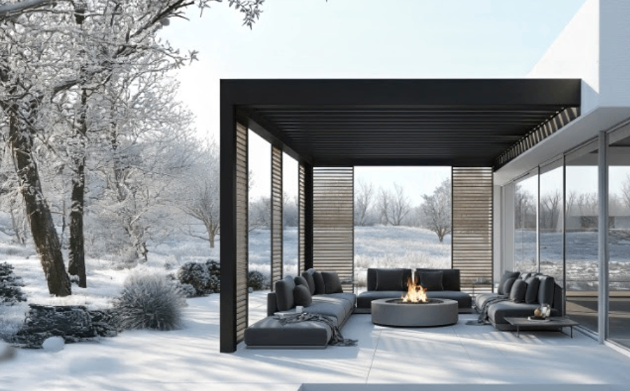 Zima: Pri vertikálnom nastavení lamiel konštrukcia bezpečne zvládne aj snehovú nádielku (cca 30 – 40 cm).