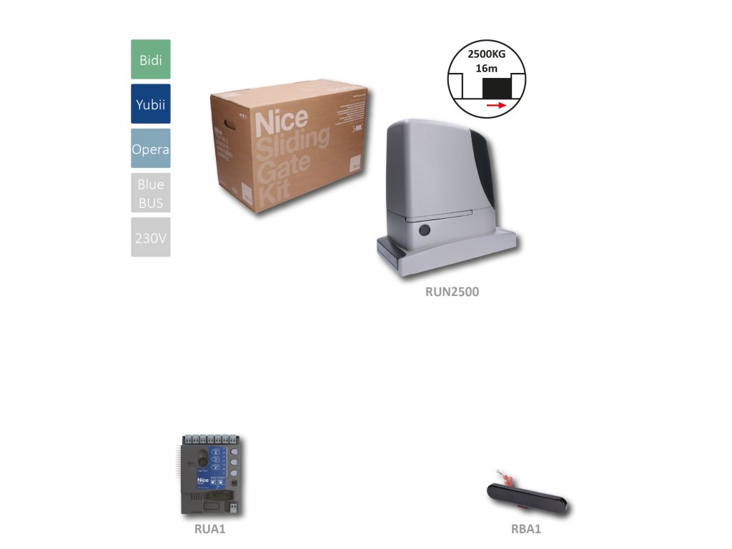 Pohon pre posuvnú bránu do 2500kg, 1x RUN2500 (230V, 870W, 1390N), 1x RUA1 BlueBus, 1X RBA1 - indukčný koncový spínač