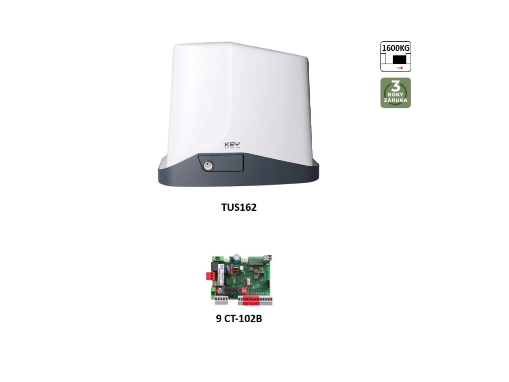 Pohon TUS162 je určený pre automatizáciu posuvných brán do hmotnosti 1600 kg. Výkonný 230 V motor v kombinácii s riadiacou jednotkou CT102B zabezpečuje spoľahlivý chod aj pri vyššom zaťažení a intenzívnej prevádzke.