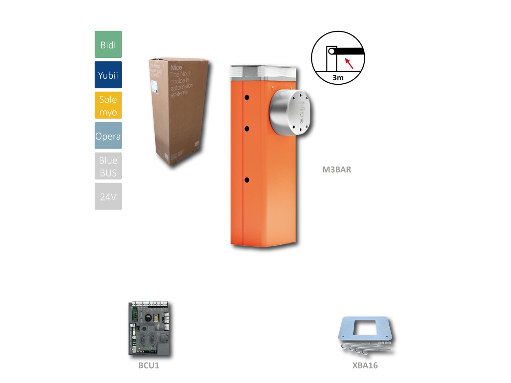 M3BAR automatická závora do 3m prejazdu (24V, 150W, 100Nm) riadiaca jednotka BCU1, 1x montážna doska XBA16, bez ramena
