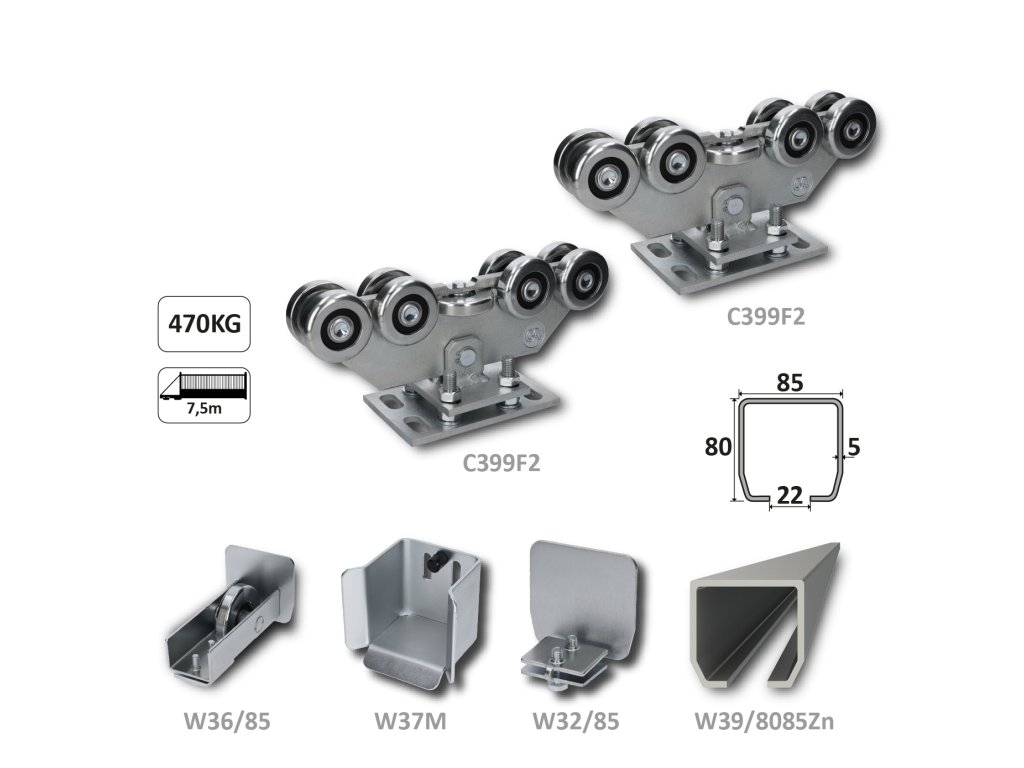 INTERMEDIO samonosný systém 80x85x5mm posuvnej brány do 470kg/7.5m otvor (W39/8085Zn 6m pozinkovaný profil, 2x C399F2, 1x W36/85, 1x C397M, 1x W32/85)