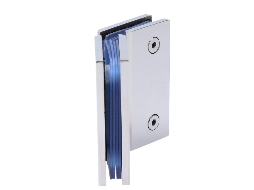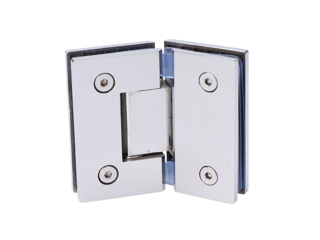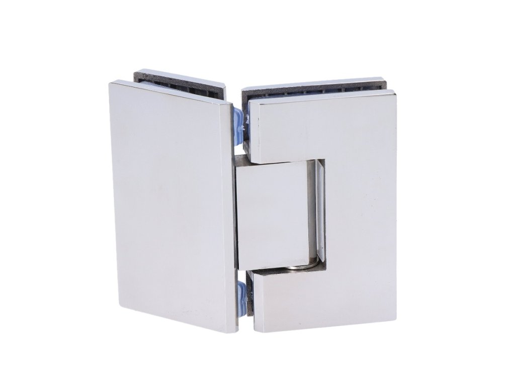 Záves na sklenený dverový systém, medzi sklo a sklo 135°, 90x100mm, hrúbka skla 8-10mm, leštená nerez AISI304, samozatváranie +-15° a samozastavenie +-90°-0°